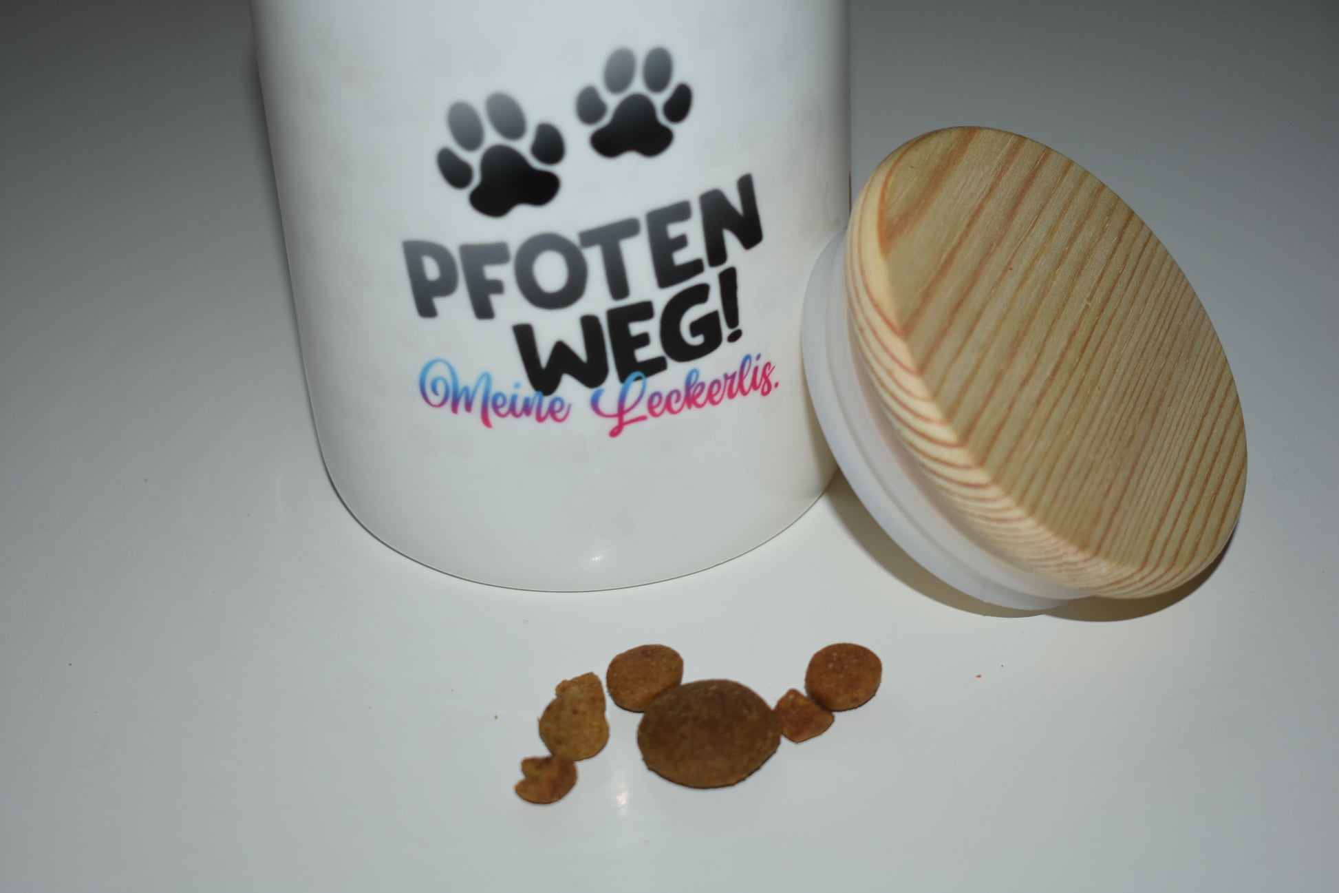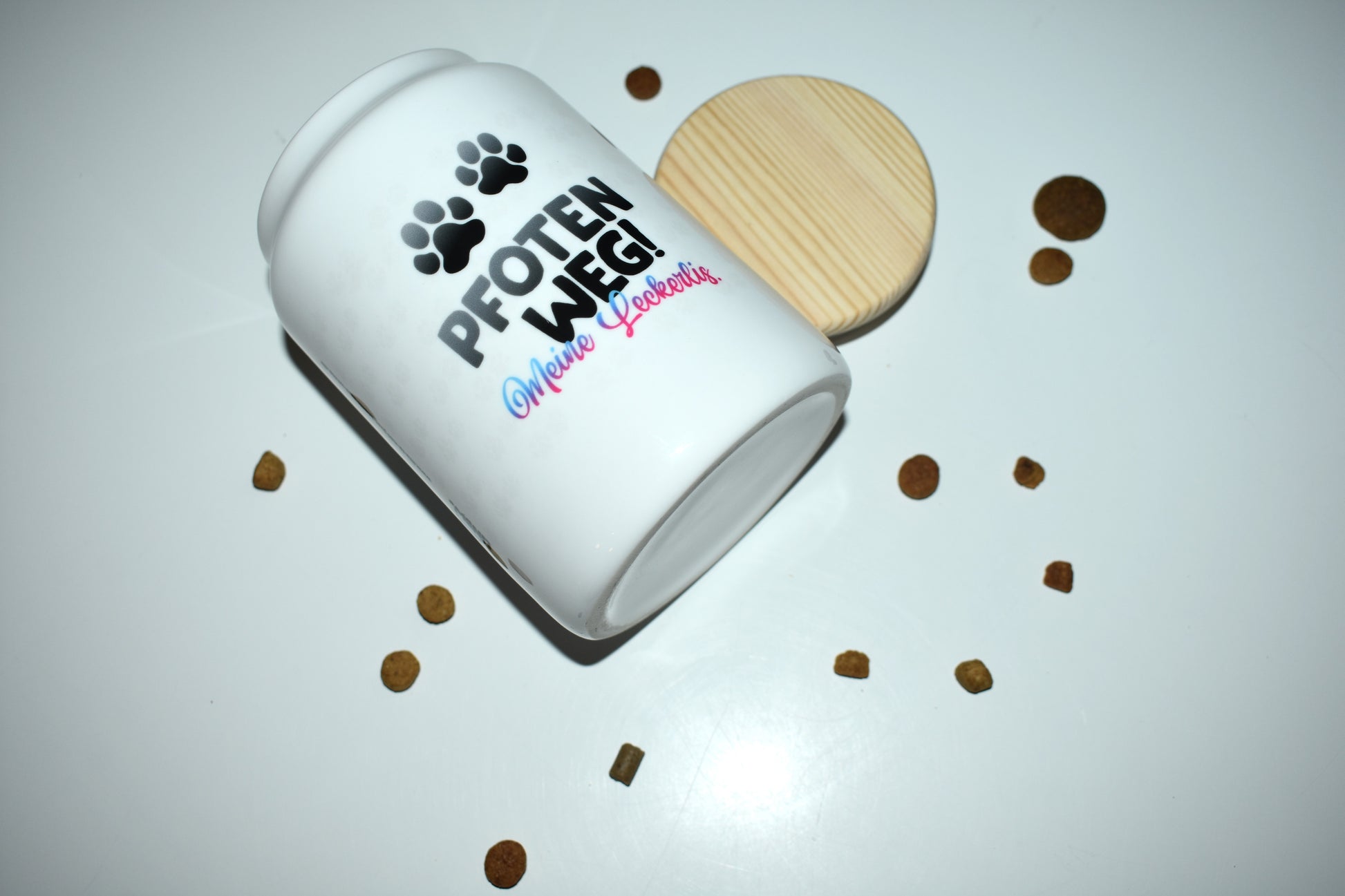 Die weiße Keramikdose mit einem liebevollen Dalmatiner-Design und dem humorvollen Spruch „Pfoten weg, meine Leckerlies“ macht sofort klar, wem die Leckerlies gehören. Der luftdichte Holzdeckel sorgt dafür, dass die Snacks lange frisch und aromatisch bleiben, während das robuste Material für Langlebigkeit steht. Perfekt für eine stilvolle und praktische Aufbewahrung!