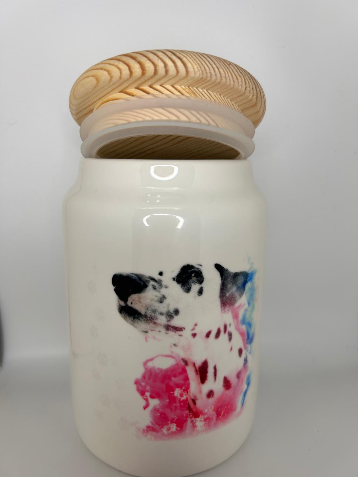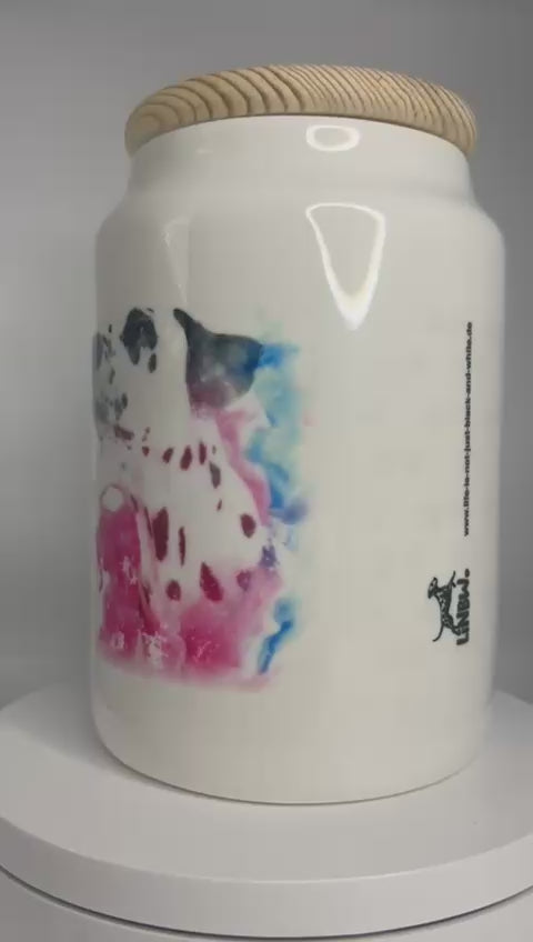 LiNBW. Leckerlidose aus Keramik mit Holzdeckel Dalmatiner "Pfoten weg, meine Leckerlies"